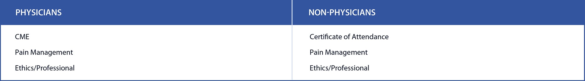 - Non-physician attendees can obtain a Certificate of Attendance, as well as pain management and ethics/professional credit.