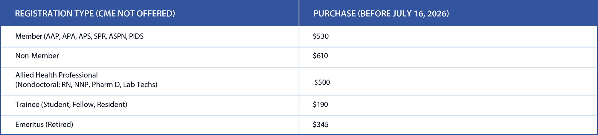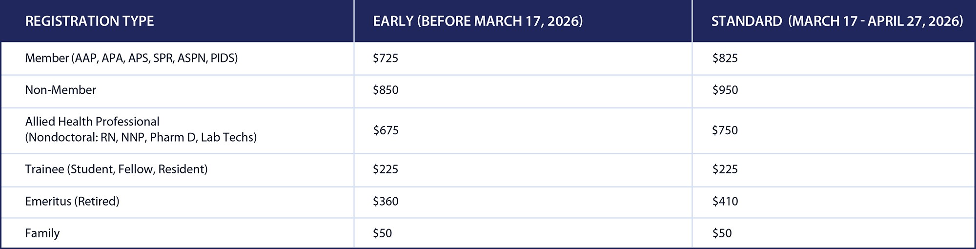 Family members are allowed to attend the PAS Meeting. Family registration allows attendance of the PAS on-site meeting, but On-Demand and CME are not included. During registration, enter the number of family tickets you wish to purchase at $50 each. Children 16 and under can enter the meeting with an adult but must have a guest badge. Please send your guest badge request to info@pasmeeting.org.